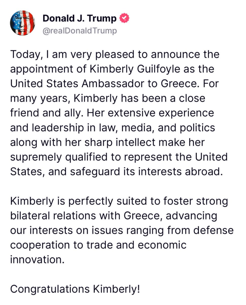 Ο Ντόναλντ Τραμπ ανακοίνωσε τον διορισμό της Κίμπερλι Γκίλφοϊλ με ανάρτηση του στην πλατφόρμα Truth Social.