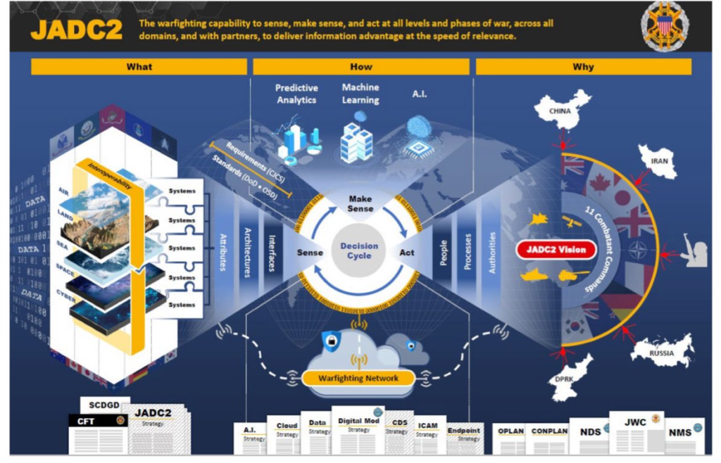 Το Joint All-Domain Command and Control (JADC2) αποτελεί το μέσο με το οποίο το Υπουργείου Άμυνας (DOD) θα συνδέσει όλο το πλήθος των αισθητήρων από όλες τις στρατιωτικές υπηρεσίες – Πολεμική Αεροπορία, Στρατό, Σώμα Πεζοναυτών, Ναυτικό και Διαστημική Δύναμη – εντός ενός ενιαίου δικτύου. Στο παρελθόν, καθεμία από τις στρατιωτικές υπηρεσίες ανέπτυσσε το δικό της τακτικό δίκτυο που ήταν ασύμβατο με εκείνα άλλων υπηρεσιών (δηλαδή, τα δίκτυα του Στρατού Ξηράς δεν μπορούσαν να διασυνδεθούν με τα δίκτυα του Ναυτικού ή της Πολεμικής Αεροπορίας).