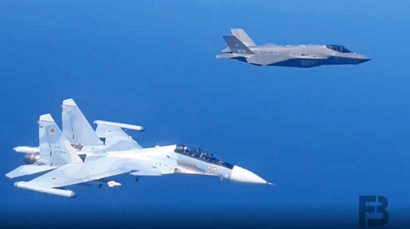 A close meeting between a Russian Sukhoi and Italian F-35A Lightning II fighter jet.
