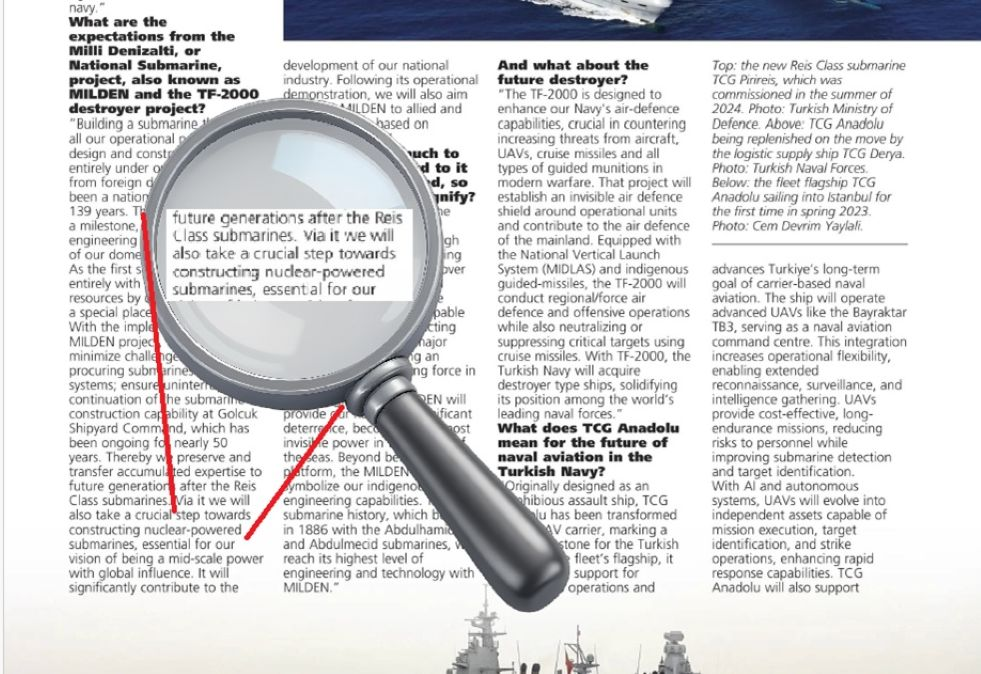 Ο Ναύαρχος Ερτζουμέντ Τατλίογλου, Αρχηγός των Τουρκικών Ναυτικών Δυνάμεων, αποκάλυψε σε συνέντευξή του στο Warships International Fleet Review ότι η Τουρκία σκοπεύει να κατασκευάσει και να εξάγει τα υποβρύχια MİLDEN, ενώ εξετάζει και την ανάπτυξη πυρηνοκίνητου υποβρυχίου. Η συνέντευξη παραχωρήθηκε στον αναλυτή Τζεμ Ντεβρίμ Γιαϊλαλί και αποτελεί τη δεύτερη φάση της παρουσίασης των στρατηγικών στόχων και του μελλοντικού οράματος του τουρκικού Πολεμικού Ναυτικού.