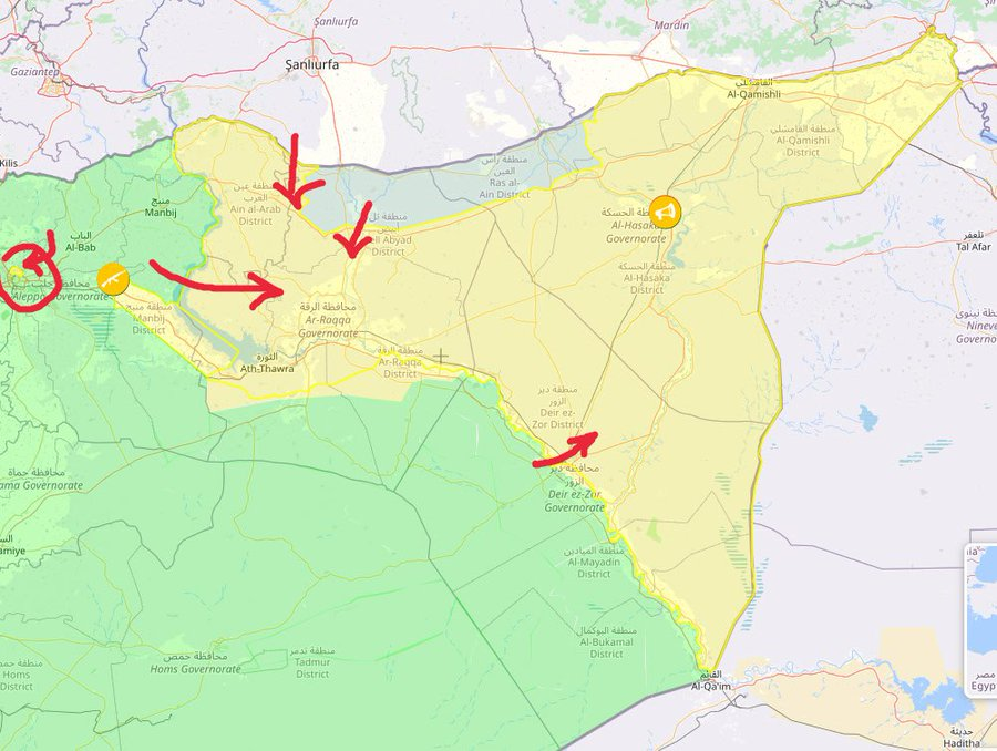 Υπάρχει μεγάλη πιθανότητα να πραγματοποιηθεί επίθεση την επόμενη εβδομάδα εναντίον κουρδικών θέσεων κοντά στο φράγμα Tishreen και στην επαρχία Deir ez-Zor. Ταυτόχρονα, οι τουρκικές δυνάμεις αναμένεται να επιχειρήσουν στην περιοχή Kobani.